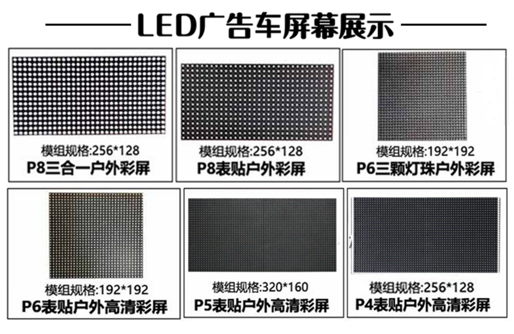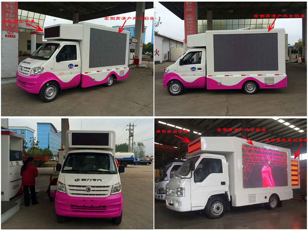 廣告車選裝配置:客戶可根據需求選裝屏幕清晰度(P10彩屏、P8彩屏、P6彩屏、P5彩屏、P4彩屏)、單面彩屏、雙面彩屏、雙面